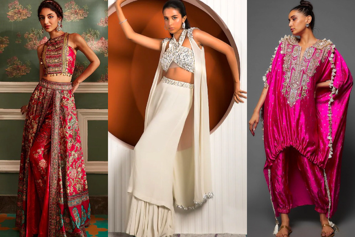 The Indo-Western trend is strong—think caped kurtas, embroidered jackets, or lehenga skirts paired with structured blazers. These mashups are stylish and perfect for both festive and casual wear.