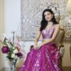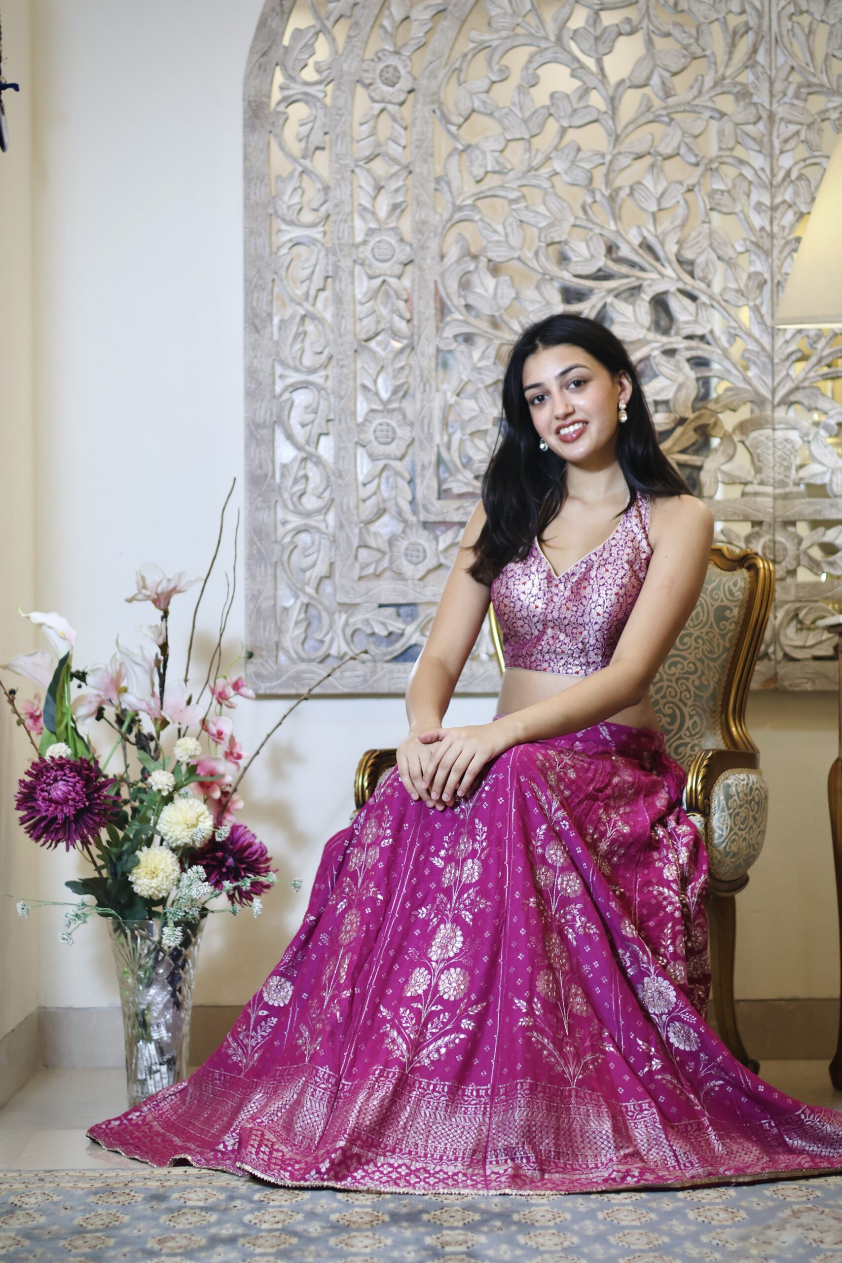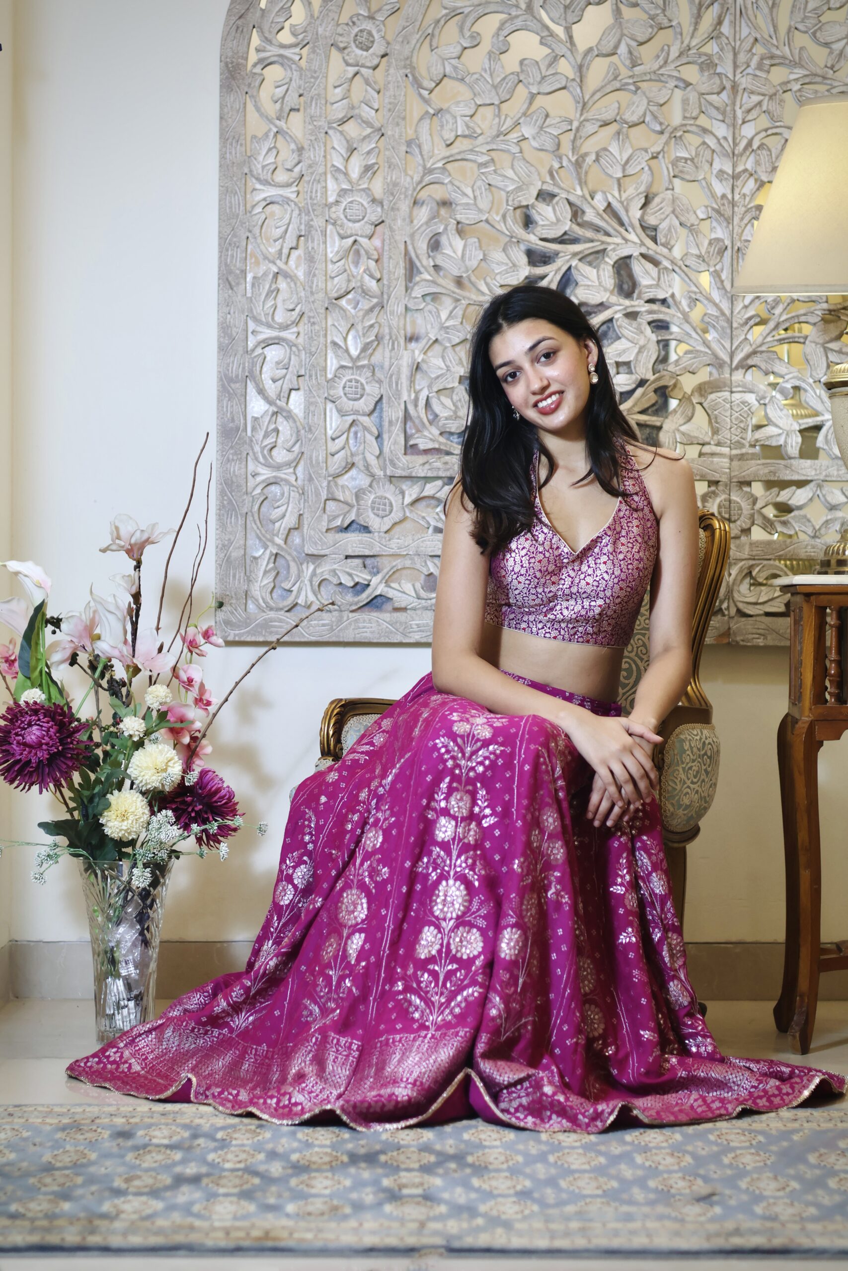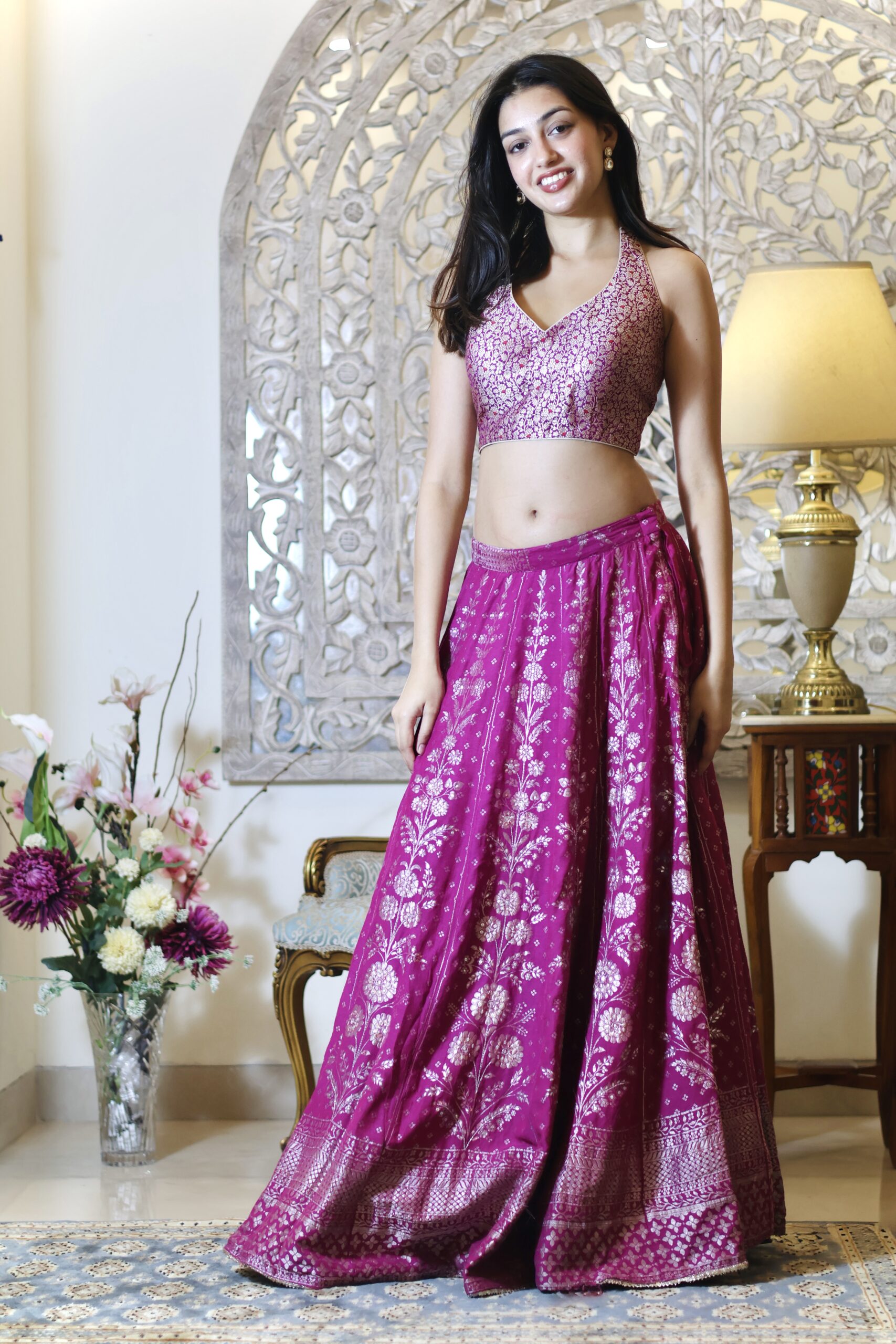 A bold magenta lehenga in pure Banarasi gorgette silk, shimmering with gold floral motifs, paired with a modern halter blouse. Perfect for sangeets and reception nights.