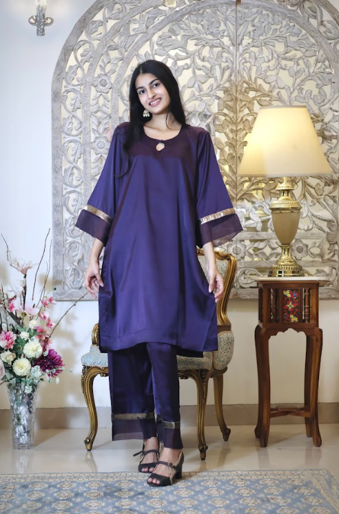 A rich purple-hued kurta set with subtle gold edging — effortlessly chic for intimate gatherings or evening outings. Understated elegance at its best.