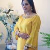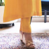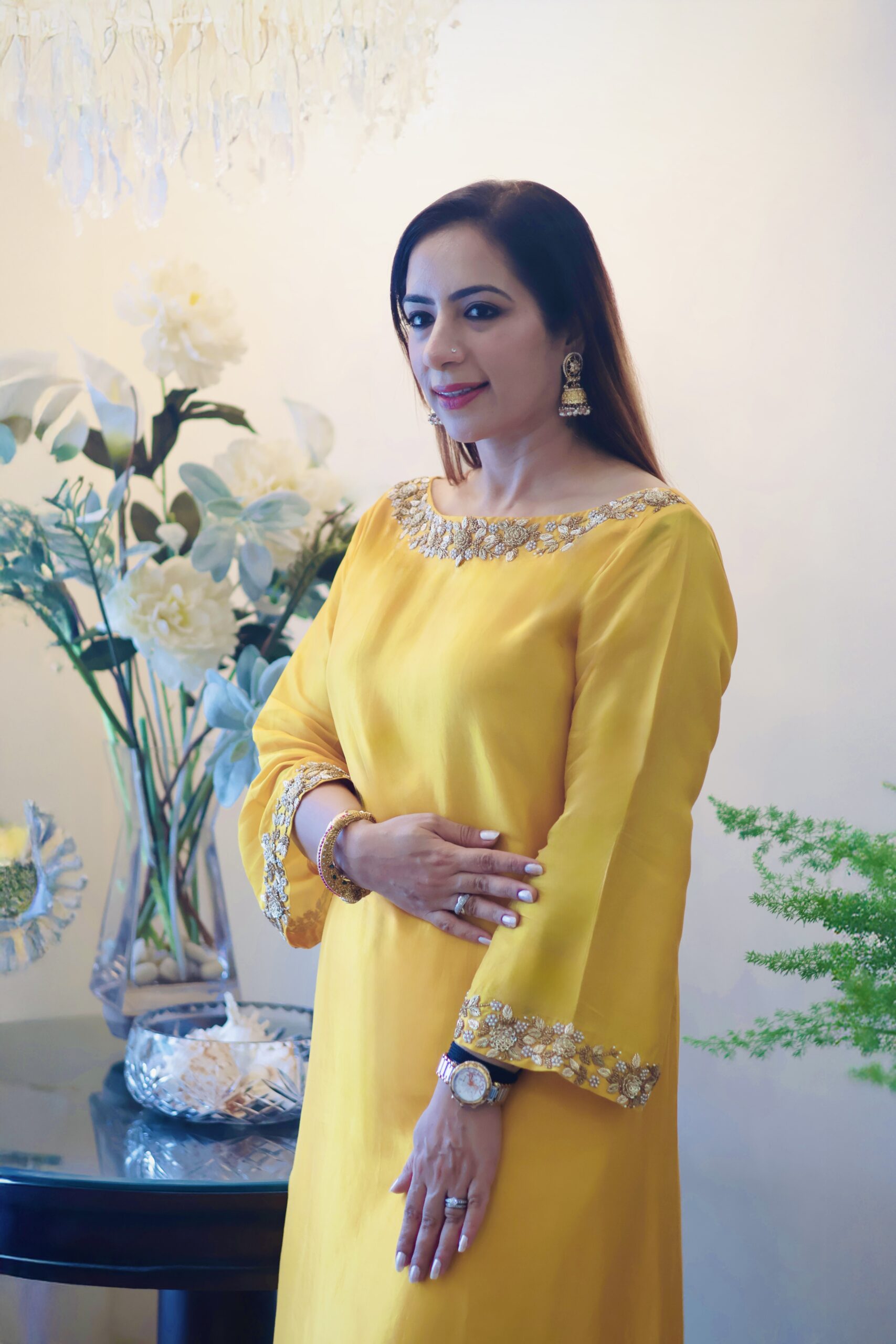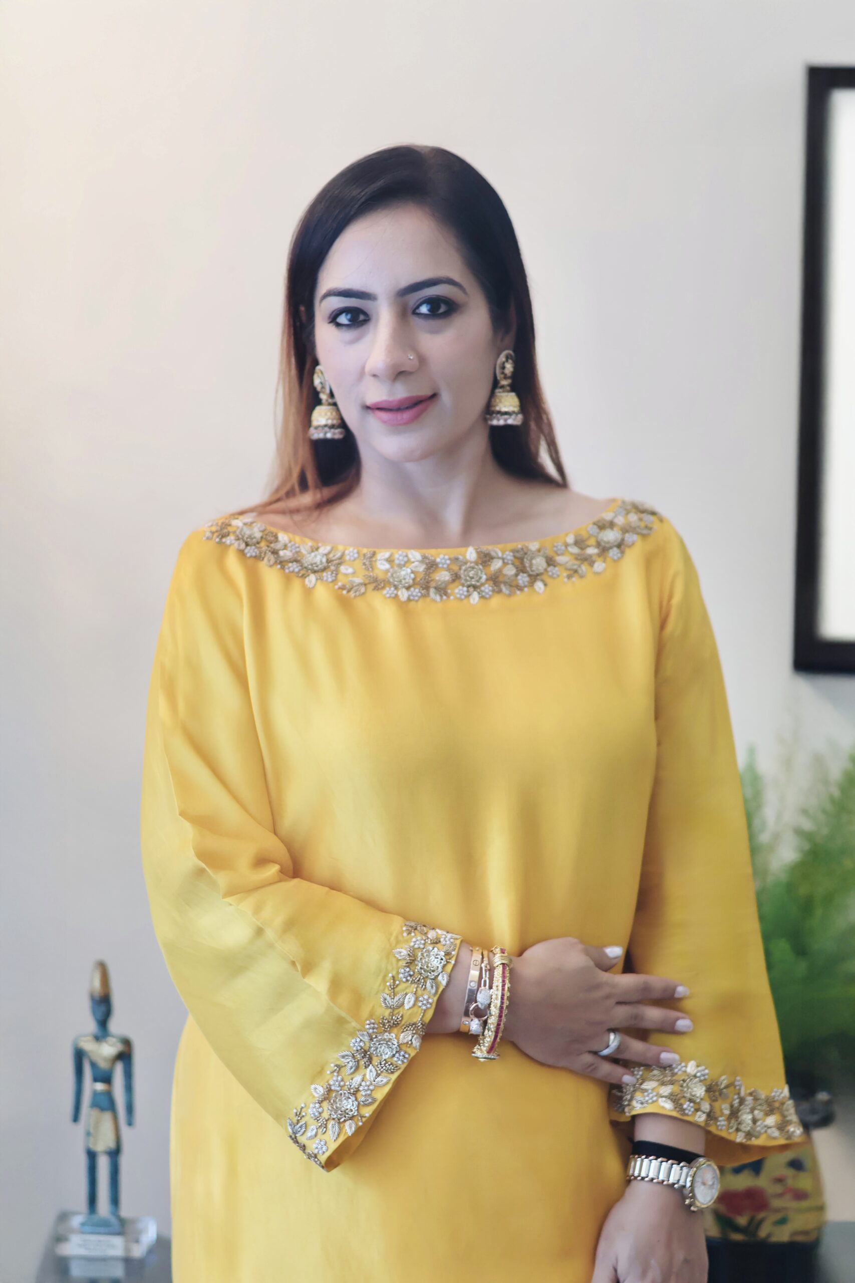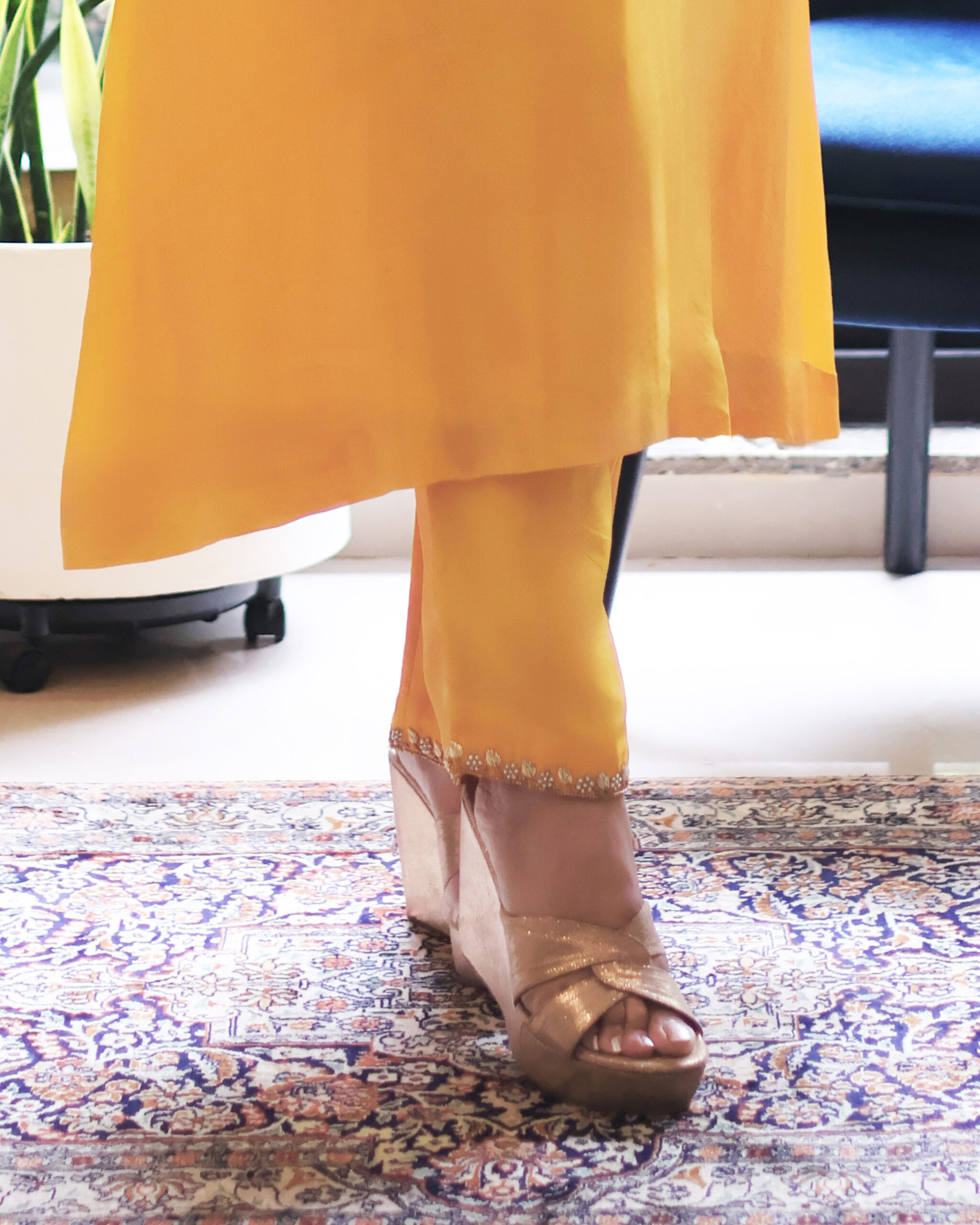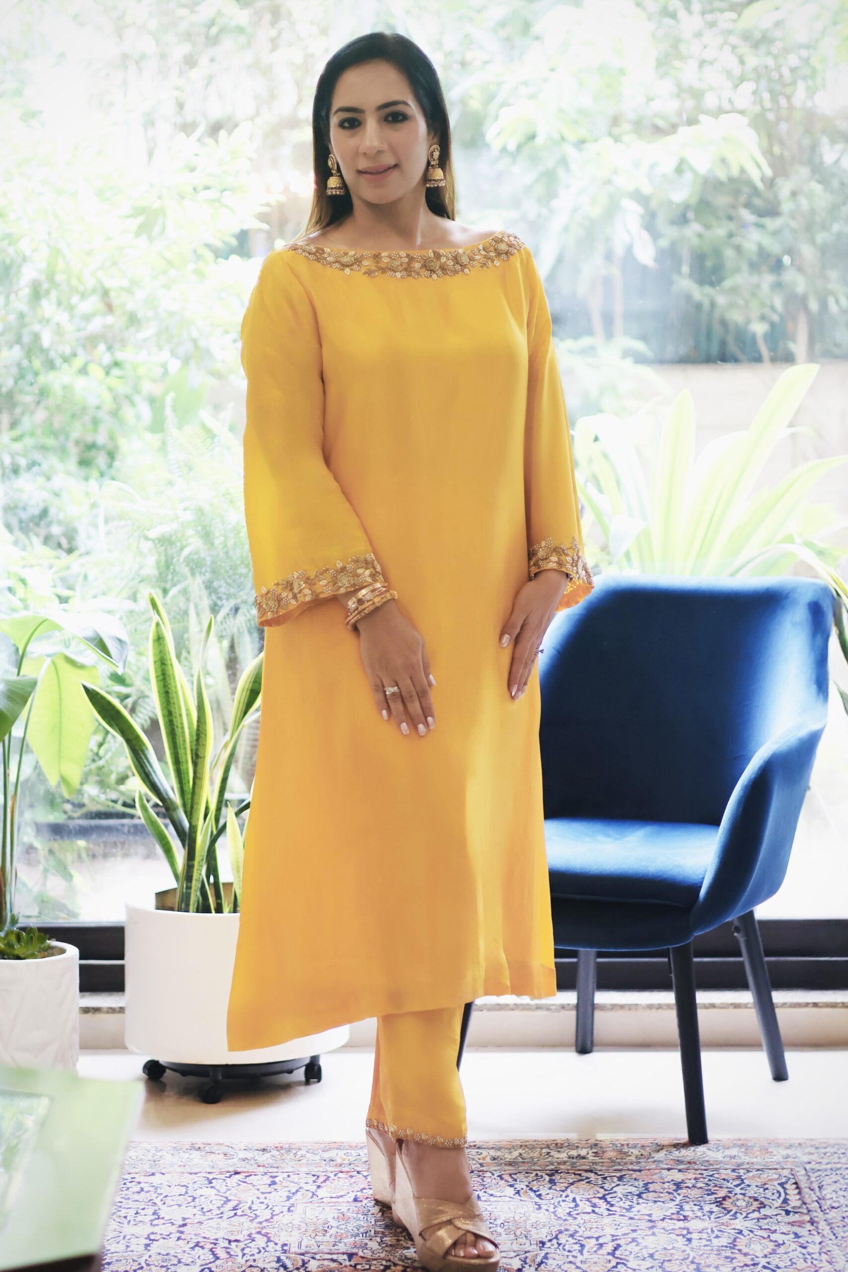 A cheerful mustard silk kurta with hand-embroidered antique gold zardozi and dabka work with pearl detailing in a boat line neckline and cuffs. An elegant tailored outfit that promises to suit any silhouette and is versatile to be worn with our without anyone of beautiful khadi georgette antique banarsi dupattas. Radiates festive charm for haldi, pujas, or joyful gatherings.